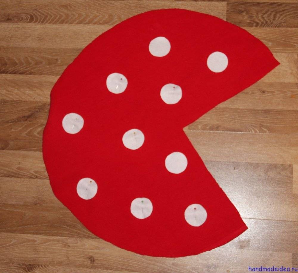 Из ткани белого цвета выкраиваем целый круг, также закладывая припуск 1,5 см по всему периметру. Из фетра или флиса белого цвета вырезаем 10 кружочков диаметром по 5 см. Равномерно распределяем пятнышки по поверхности будущей шляпы и фиксируем их портновскими булавками, здесь припуски уже не нужны. Аккуратно пришиваем каждый кружочек швом «назад иголка» близко к контуру.