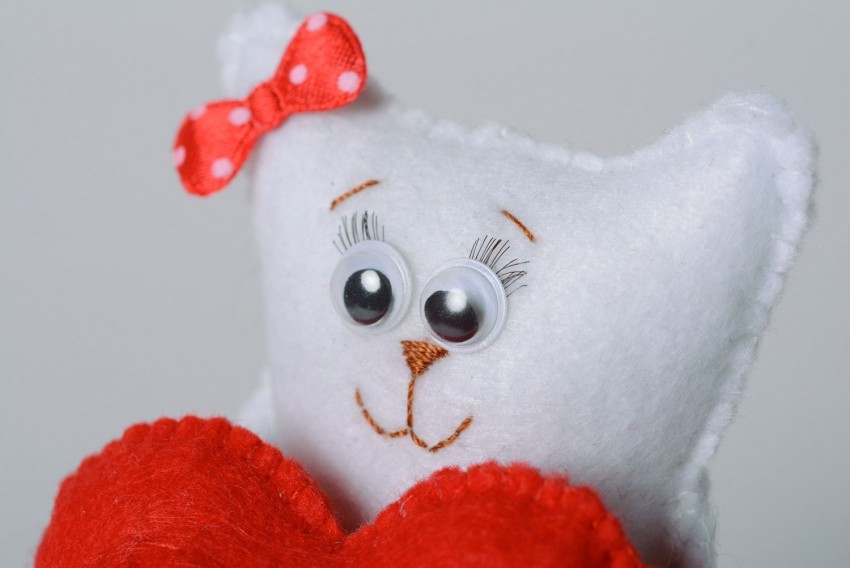 - Шаг 6. Теперь можно украсить нашу поделку. Завяжите на шее кошечки бантик из атласной ленты, а на туловище можно пришить пятнышки из фетра другого цвета. Наша кошечка готова!