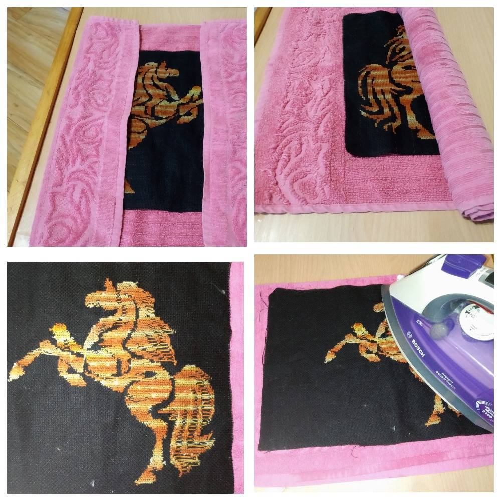 Постиранные полотна с вышивкой крестиком не отжимают и не сушат обычными методами. Изначально изделие заворачивают в махровое полотенце рулетом и аккуратно сдавливают. Два раза полотенце меняют на сухое. Когда ткань максимально подсушена, но остается еще слегка влажной необходимо прогладить вышивку с изнаночной стороны утюгом в режиме «Шелк». При этом лицевой стороной полотно укладывают на мягкое полотенце.