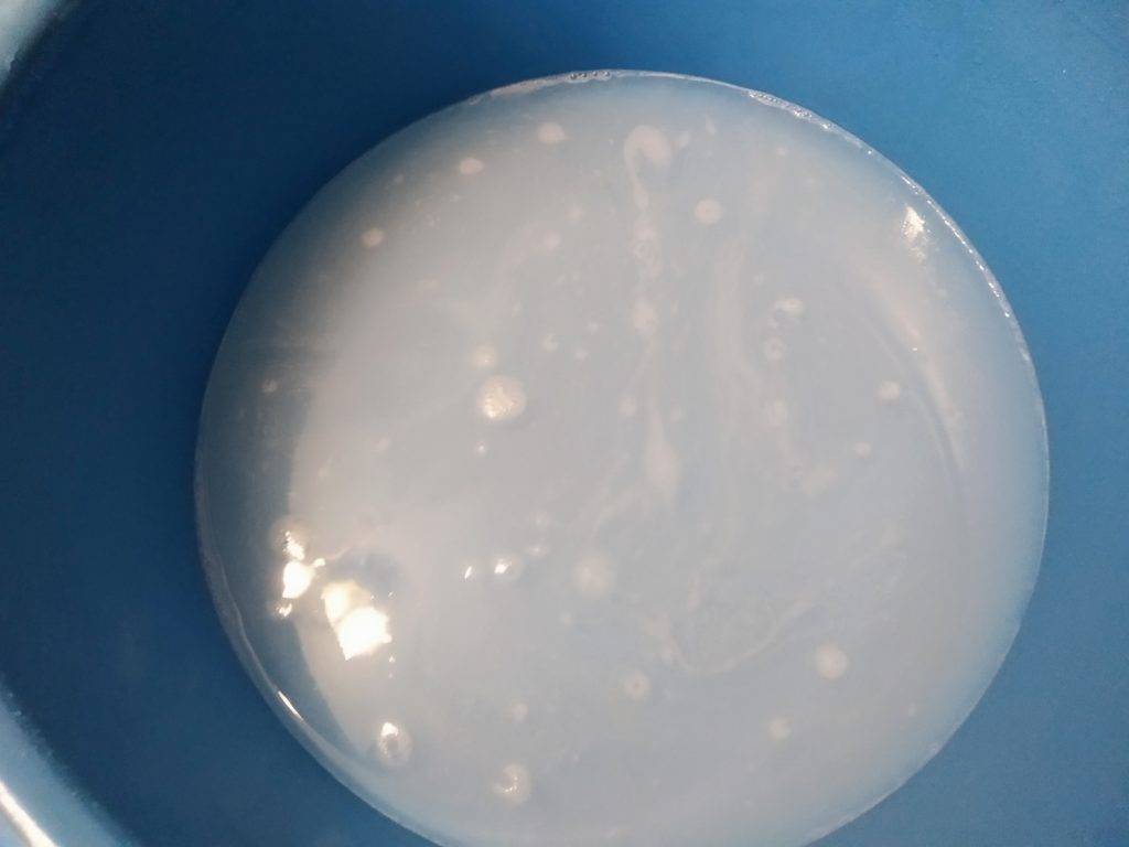 - Моющее средство (желательно жидкое) добавьте в небольшом количестве, чтобы не пришлось слишком долго полоскать полотно. Взбейте его в пену.