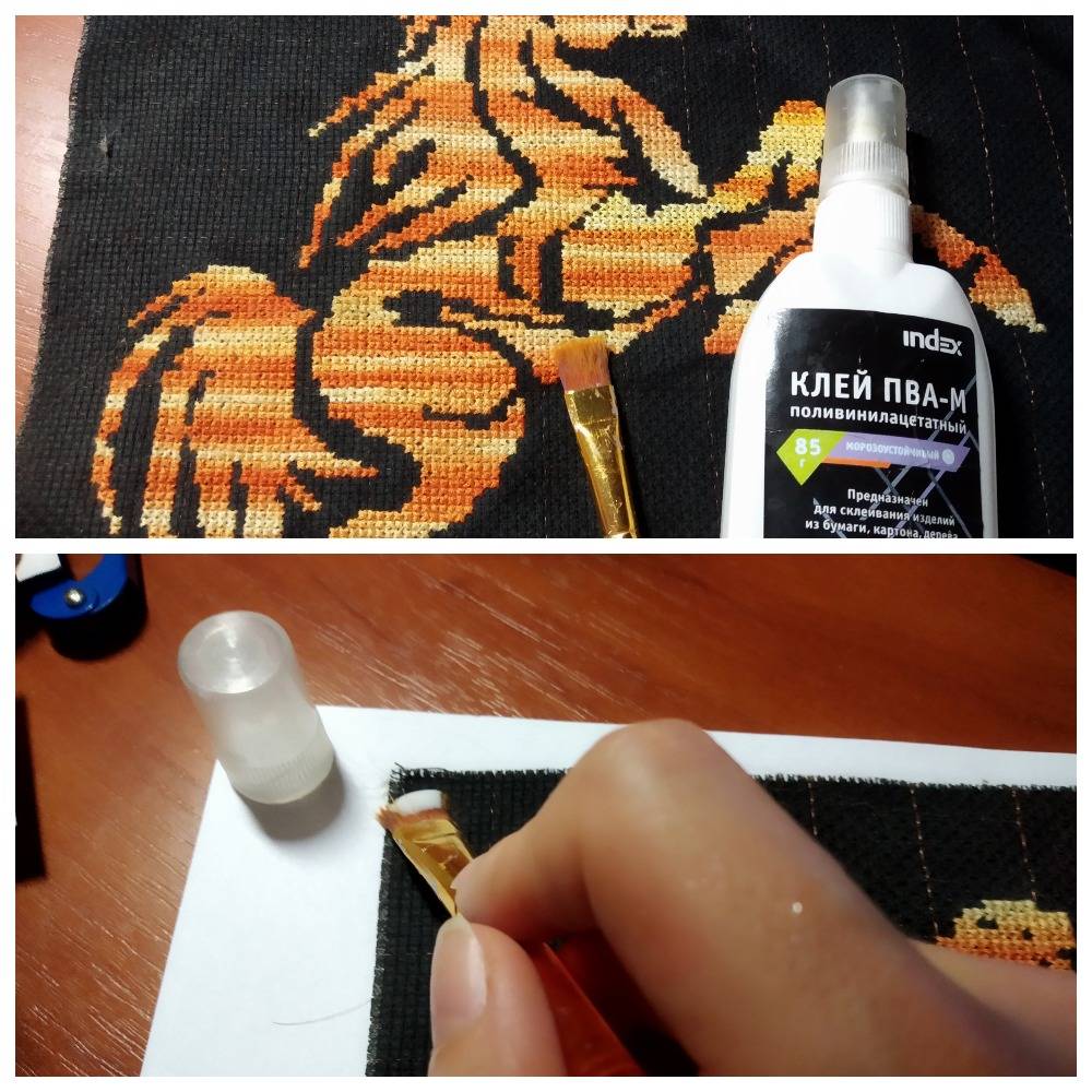 Чтобы в процессе вымачивания, стирки и глажки края канвы сохранили свою форму, достаточно обработать их бесцветным лаком или клеем. Также допускается машинная строчка.