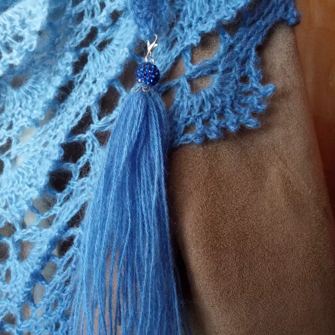 - Кисти. Кисти можно создать из той же пряжи и украсить ими углы шали. Дополнительно кисти можно разместить на кайме изделия. Кисти делают шаль не только нарядной, но и практичной. Кисти придают дополнительный вес концам шали, из-за чего в ней проще кутаться, она не развивается на ветру и в ней невозможно запутаться.