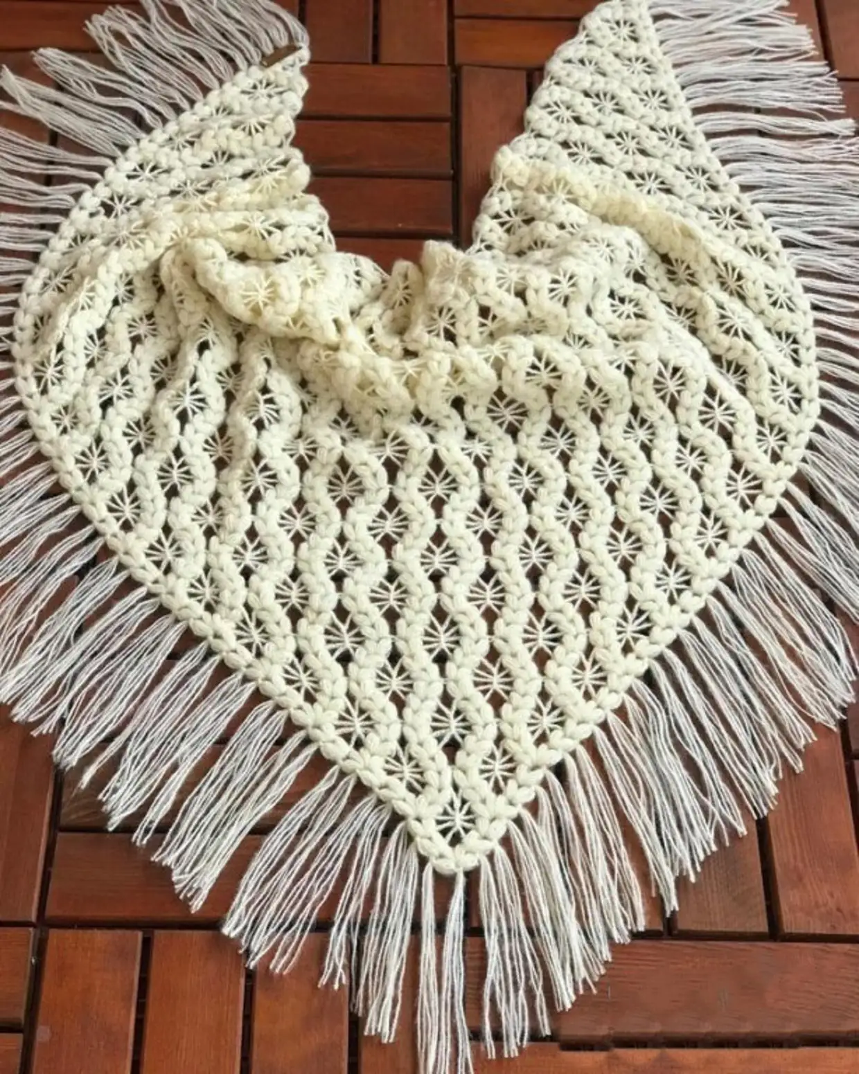 Бахрома — это длинные нити, которые добавляют объем и движение к вашей шали. Она может быть прикреплена к краю шали или создана на основе существующего узора.