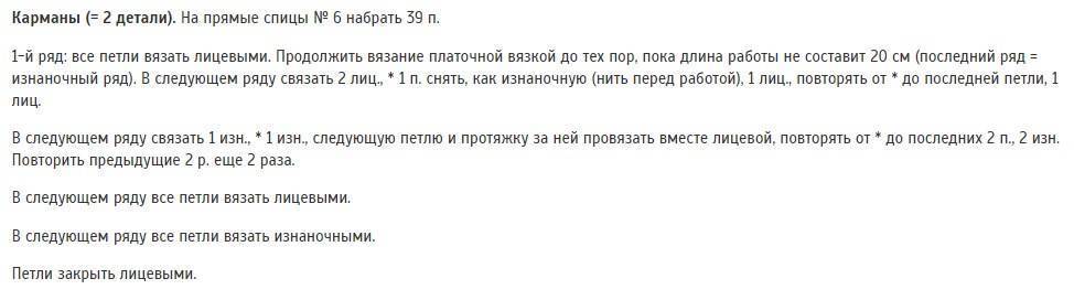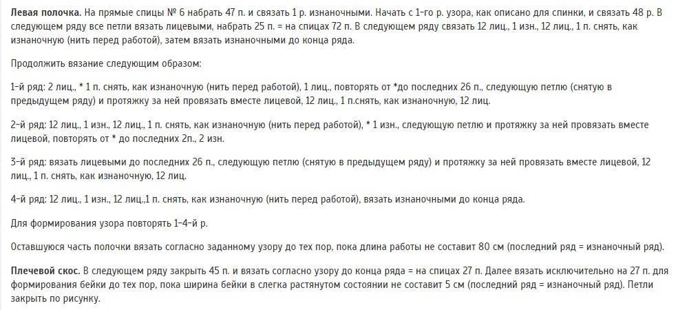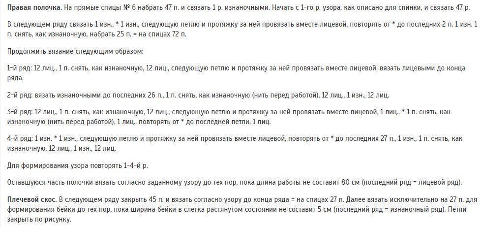 - Для правой полочки нужно набрать 43–51 ВП. Воссоздать узор из 8 петель 5–6 раз за ряд. Через 46–48 см провязать 31–43 ряды. Закрепить нить.