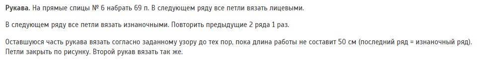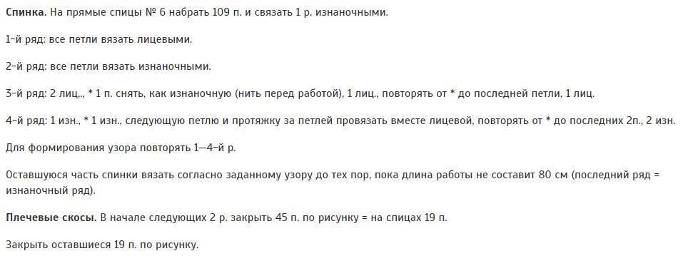 И описывать тут особенно нечего, так как форма простая прямоугольная, даже рукава. Делаем расчет необходимо числа петель, связав образец, и вяжем узором согласно схеме.