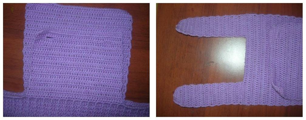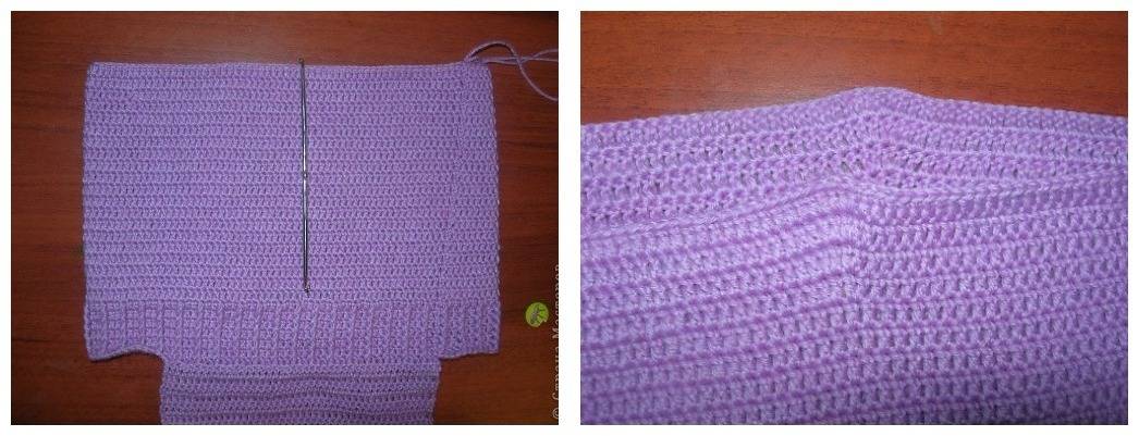 - Перед вязать аналогично только из двух половинок. Для этого полотно не откладывать, а продолжать вязать каждую часть до линии плеча.