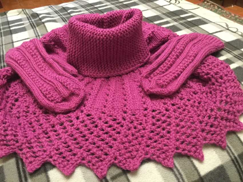Изделие вяжется сверху вниз на двух прямых спицах с вывязыванием планки. Горловина не складывается пополам, а вяжется на высоту шей.