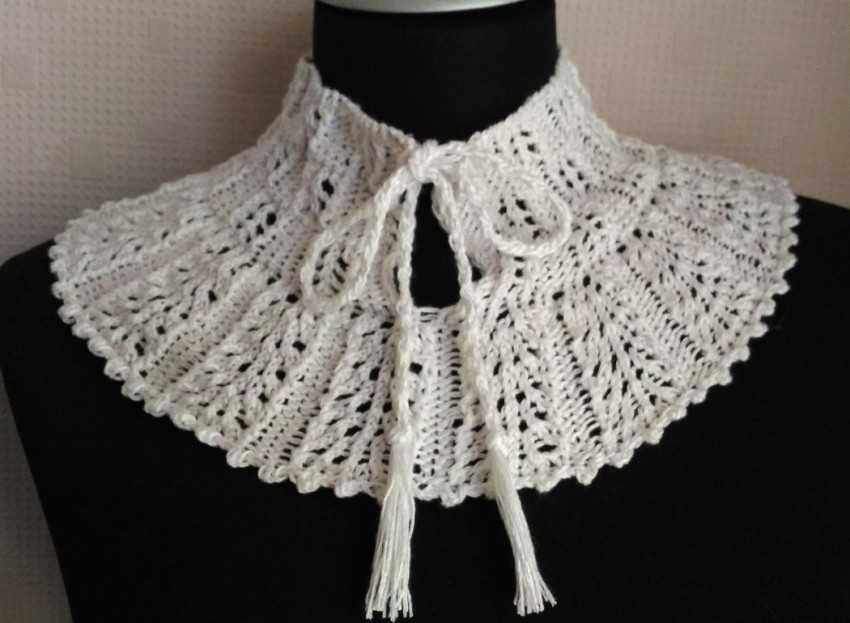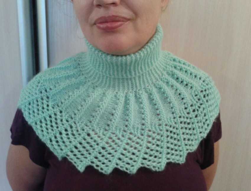 Манишки любят те, кто предпочитает практицизм в одежде, ведь она плотно прилегает к шее и надежно защищает от холодных ветров. Посмотрите на схему красивой манишки для девушки спицами на леске.