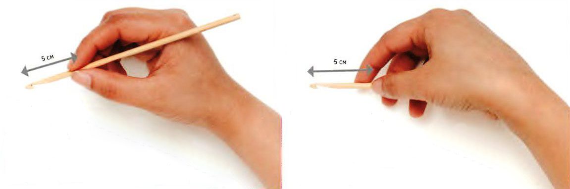Вязальный крючок можно держать как карандаш (слева) или как нож (справа).