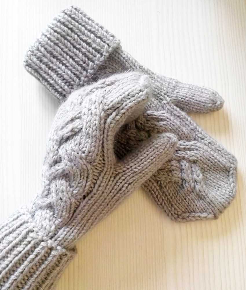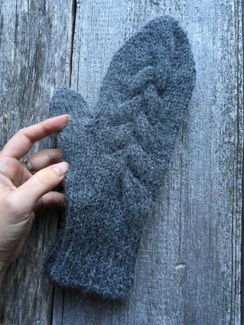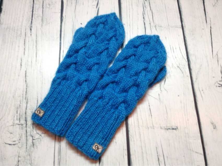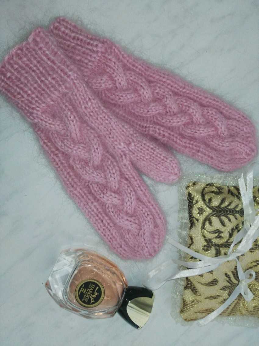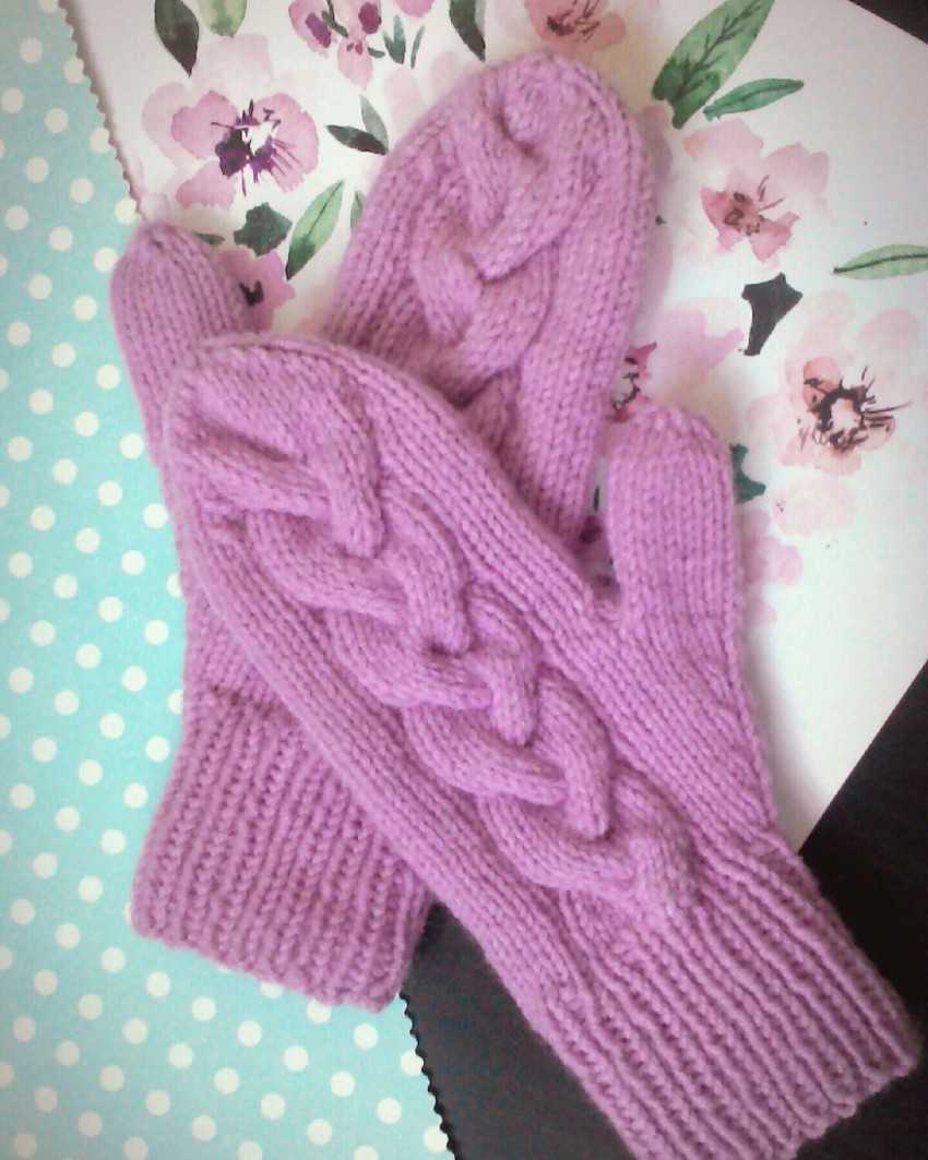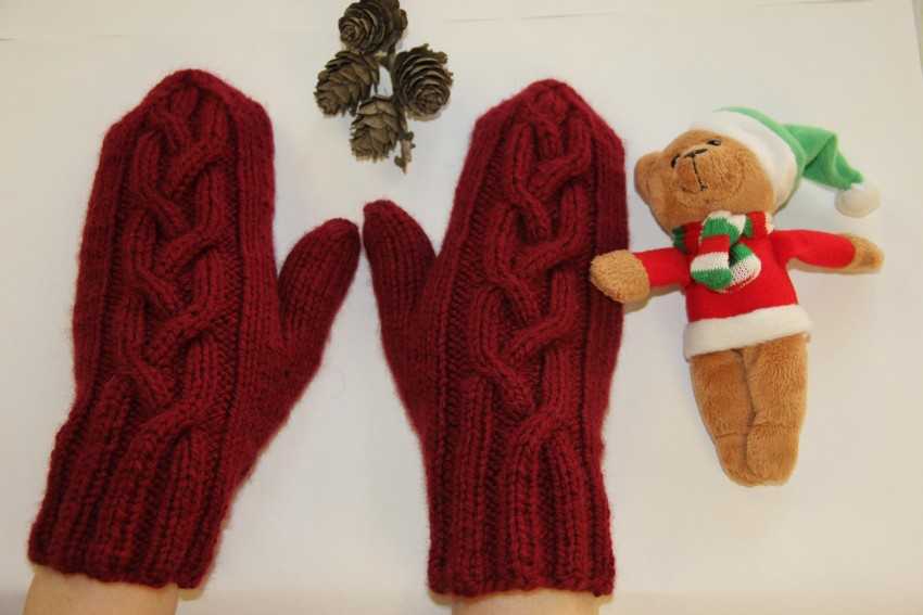 - тонкая нить позволяет набрать большое количество петелек и изобразить несколько сложных кос на рукавицах;