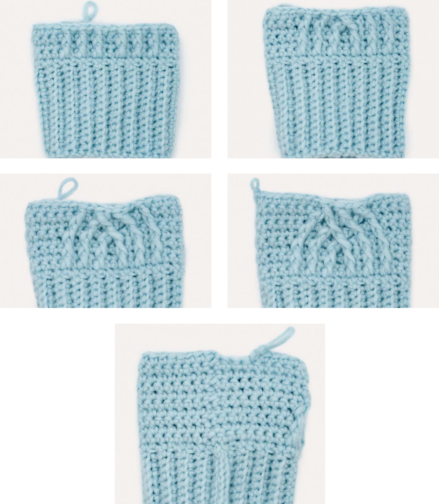 Вязание большого пальца происходит по тому же принципу: набираем вокруг отверстия для пальца полустолбики и вяжем нужной длины, после чего заканчиваем так же, как основное полотно: убавляем 2 через 2 полустолбика, пока не останется 8 петель. Протягиваем нить через оставшиеся петли и затягиваем.