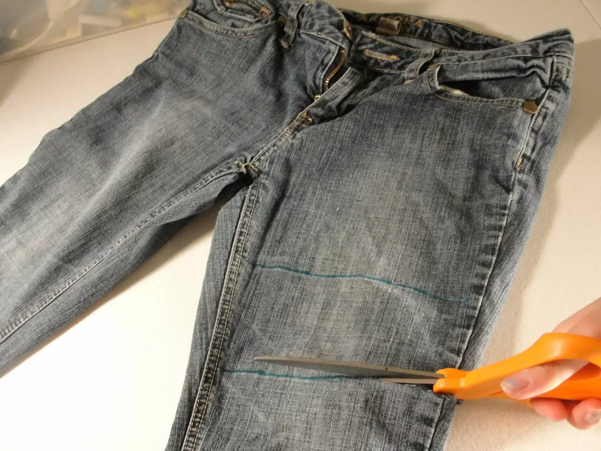 С помощью острых ножниц или ножа аккуратно обрежьте джинсы по отмеченным линиям. Для достижения ровного и аккуратного края следует обрезать джинсы по всей ширине ноги.