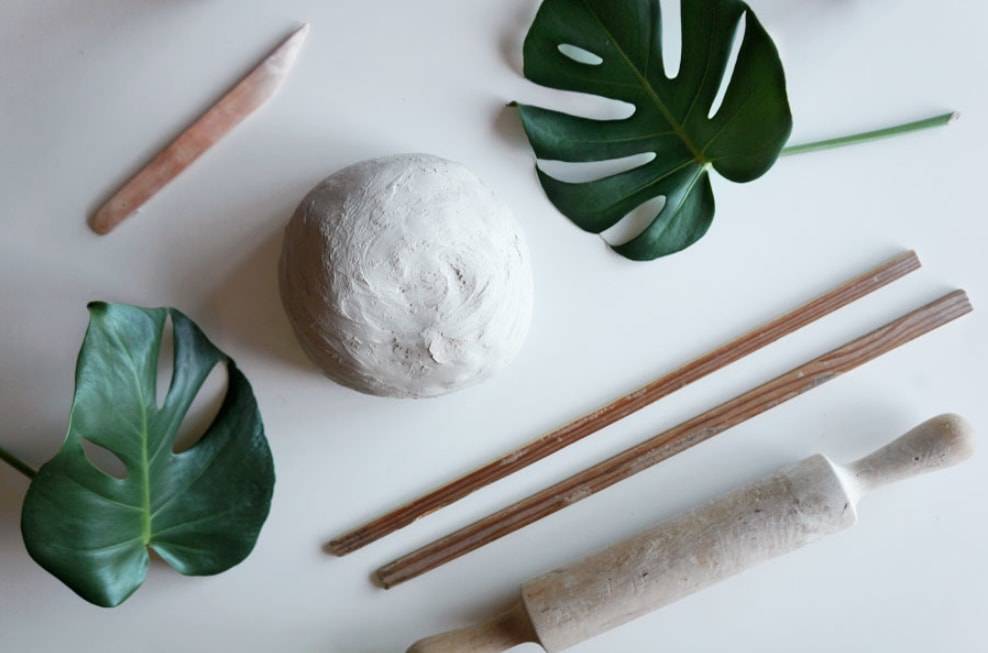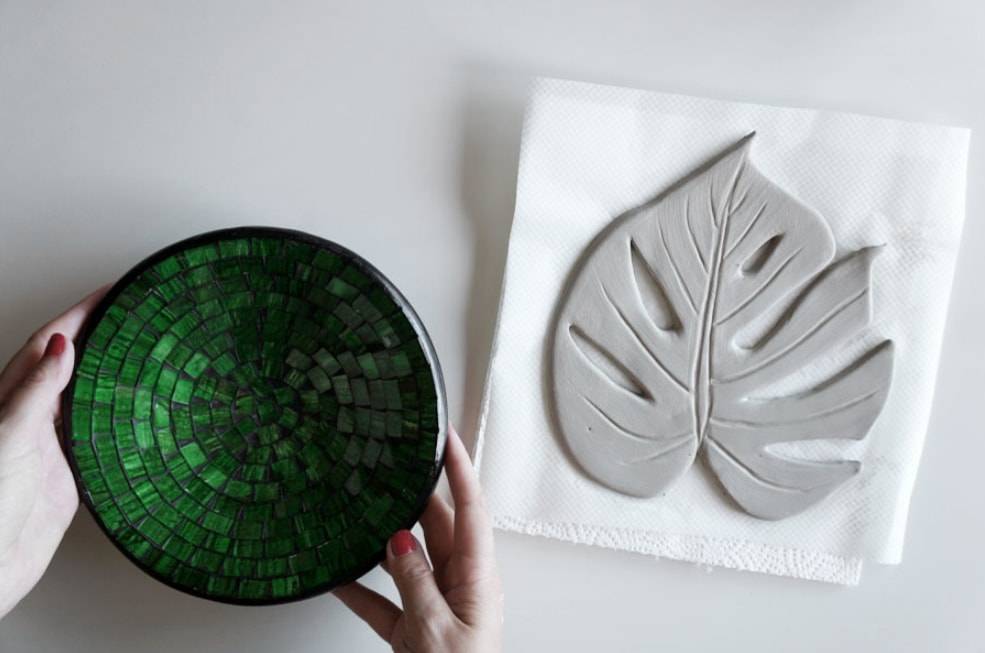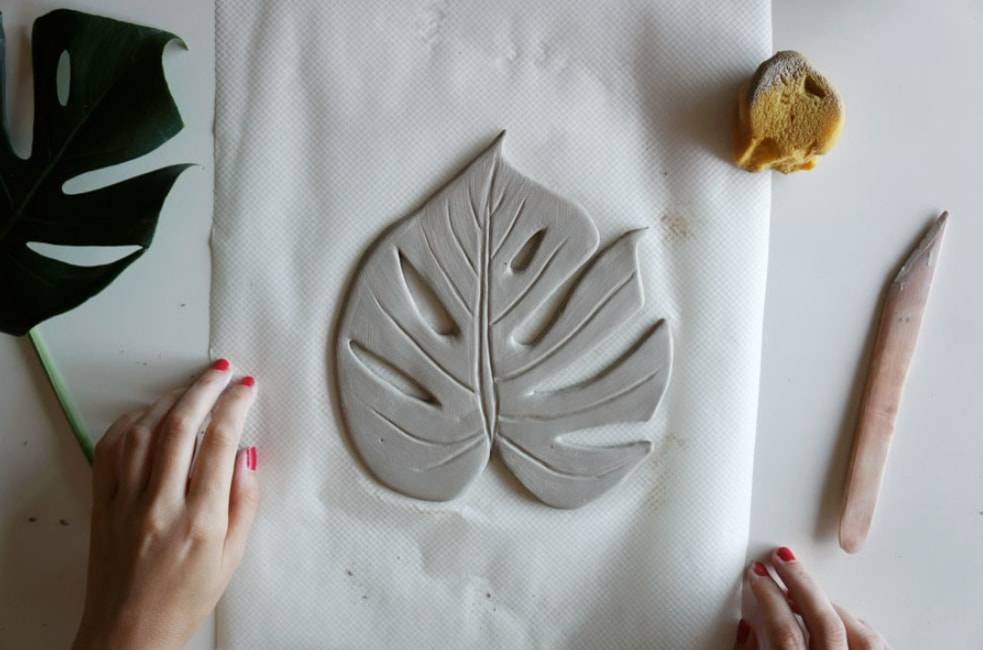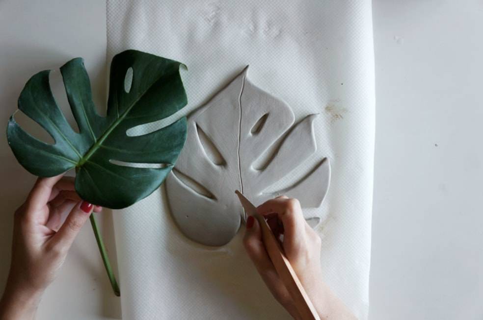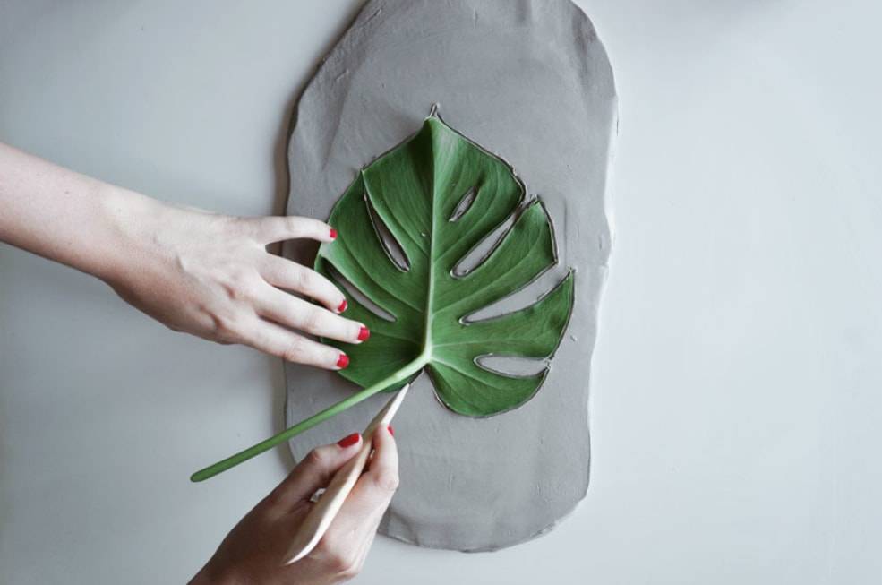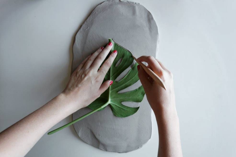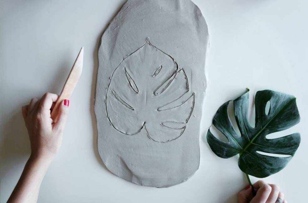 Кладем на глину лист монстеры и обводим контуры деревянной палочкой.