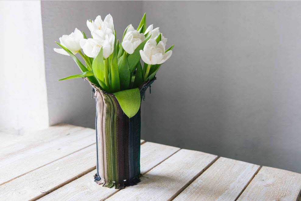 Ваза из пластиковой бутылки с декоративным чехлом из разноцветных молний выглядит гораздо привлекательней!