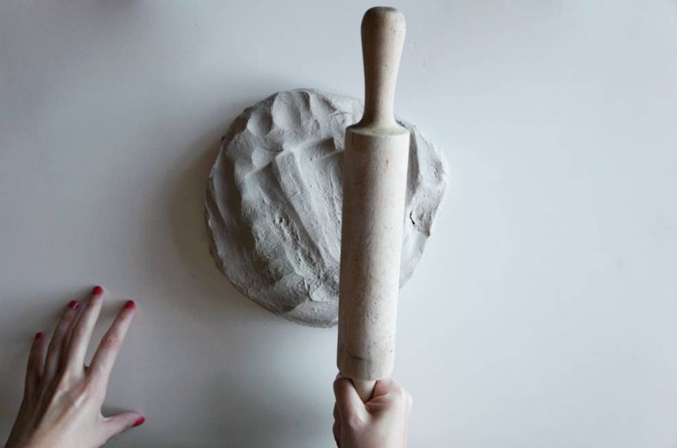 Раскатываем глину до тех пор, пока ее толщина не станет 2 см. После этого кладем по краям рейки и раскатываем ее до тех пор, пока она не станет плоской.