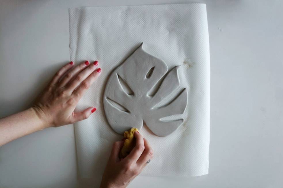 С помощью палочки рисуем на заготовку прожилки, как на листе монстеры. После этого также проводим по ним слегка влажной губкой.