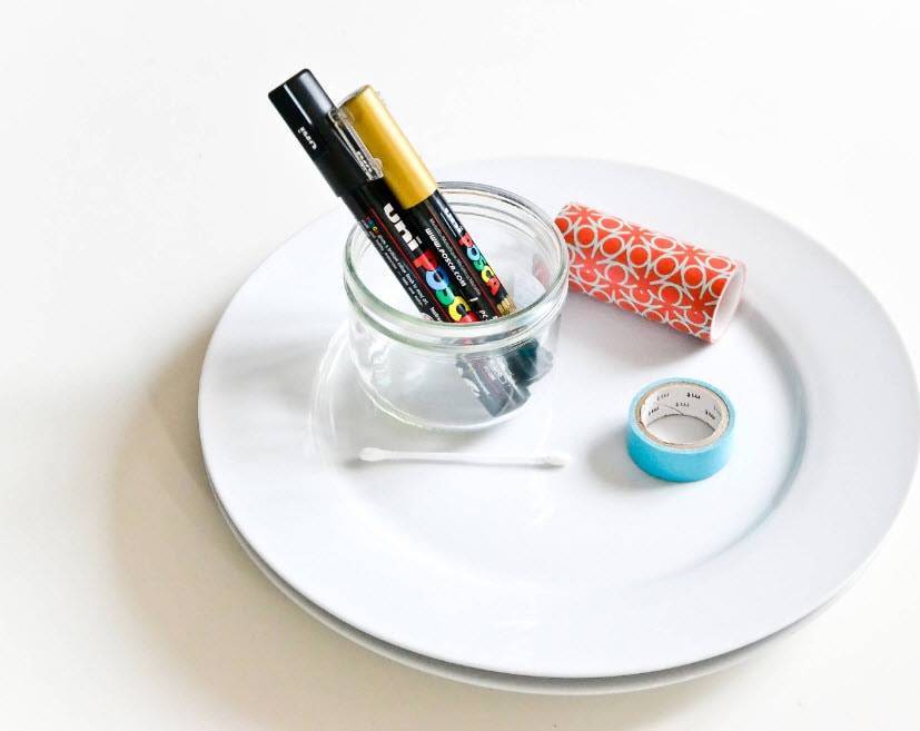 Необходимые материалы: белые тарелки, скотч, специальные фломастеры, вода, ватные палочки и духовка. Ватные палочки со стаканом воды понадобятся для того, чтобы корректировать узор.
