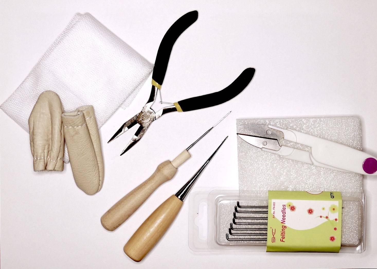 Для каждой техники валяния нужны свои инструменты и красители. Для сухого необходимы: мат (или подложка), щетка, поролоновая губка и иглы. Иногда могут понадобиться клеевой пистолет, проволока (для сложных гибких игрушек) и швейные иглы. Также рекомендуется использовать пастель для мягкой тонировки или акриловые краски для яркого окрашивания. Мокрое валяние предполагает свои принадлежности: мыльный раствор, сетку, пузырчатую пленку, полотенце.