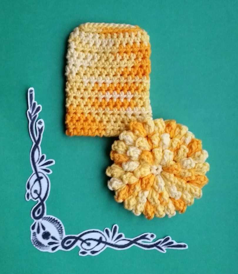 Для начинающих подойдет самый простой вариант исполнения – платочный узор. Его особенность заключается в необходимости провязывать петли в передних и задних рядах. Вязаные губки также могут быть в виде рукавичек, которыми удобно работать.