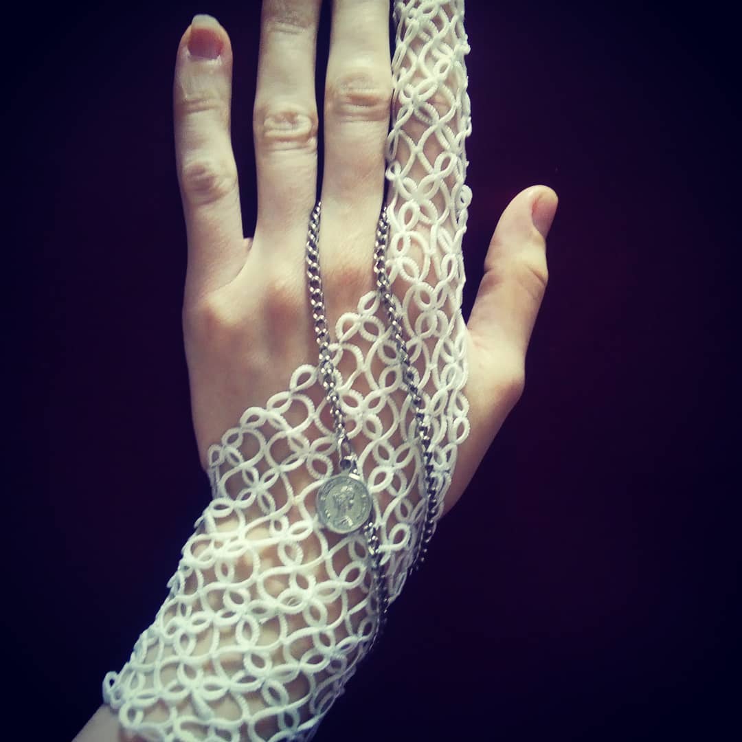 - Область запястья обозначьте короткой резинкой, изнаночным рядом, ажурными дырочками для декорирования шнурком или лентой.