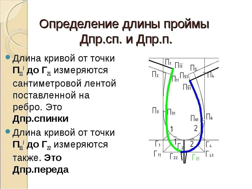 Высота проймы равна полуобхвату груди поделив на 4 + 5 сантиметров. Пройма обладает двумя изгибами: верхним и нижним. Один отклонен в сторону, другой начинается на одной трети высоты груди.