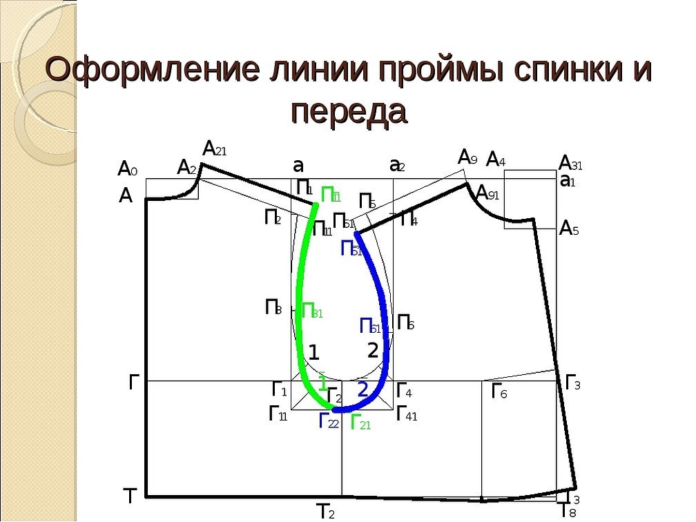 Пройма всегда равна одной четвертой грудного полуобхвата. Всегда опускается вниз к линии груди. Верхние две трети высоты идет ровно вниз.