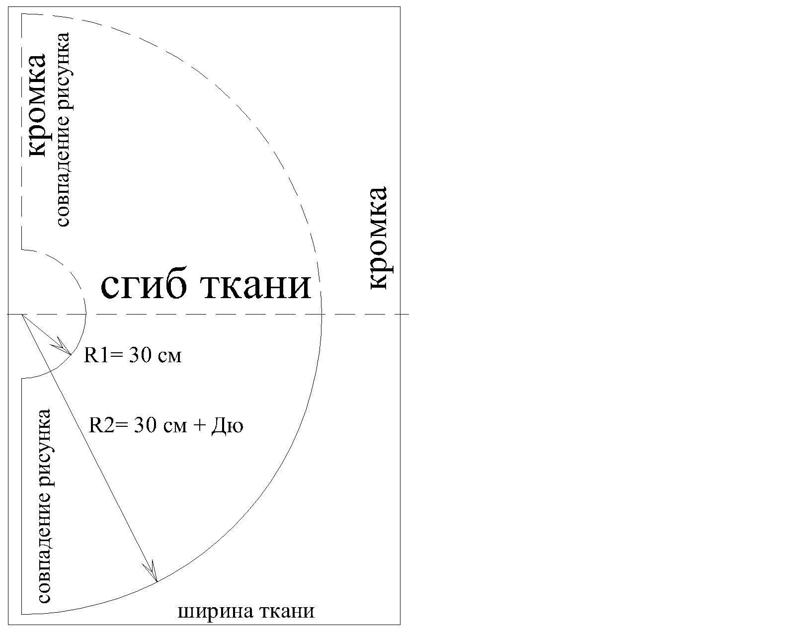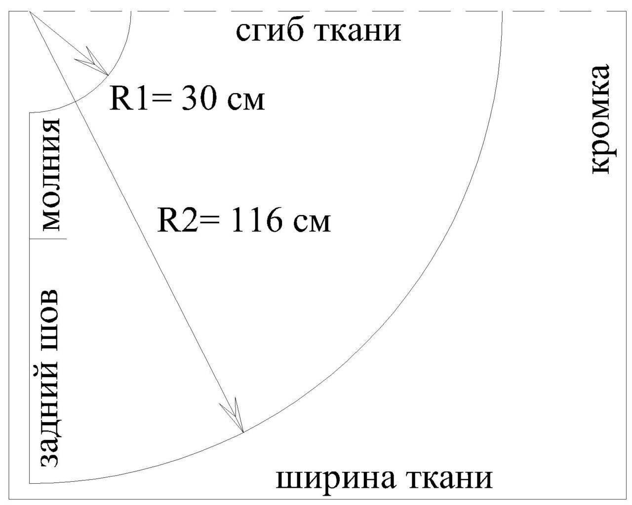 На бумаге рисуется полукруг, радиус которого находится по формуле: R = (От +15см)/3,14, где От – обхват талии. От полученной линии откладывают длину изделия.