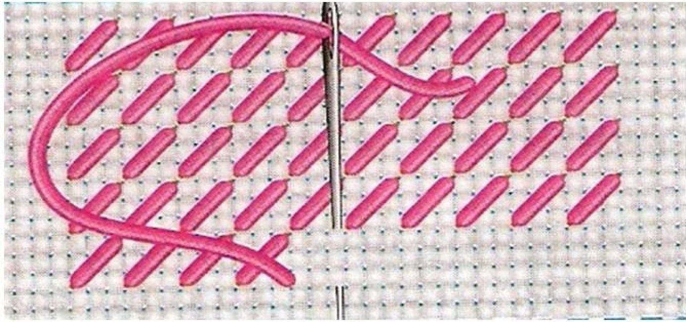 Применяется на крупных вышивках: гобелены, подушки. Им заполняется вся картинка, придавая предмету объемность.
