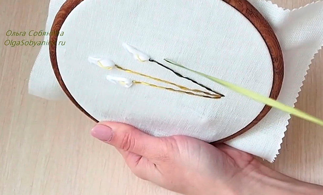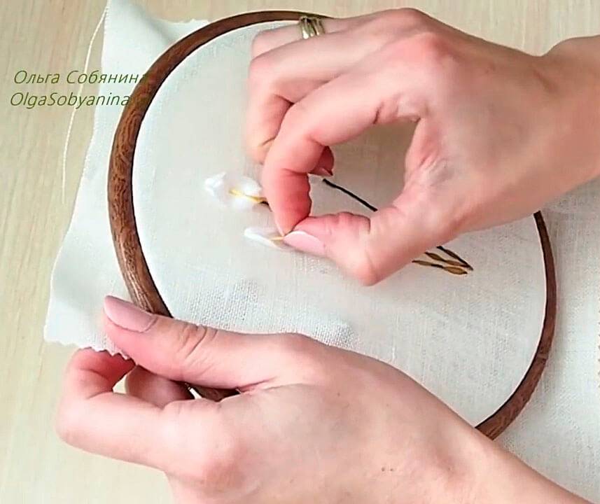 Вышиваем второй стебелек. Так же скручиваем ленточку пальцами и выводим ленту на лицевую сторону.