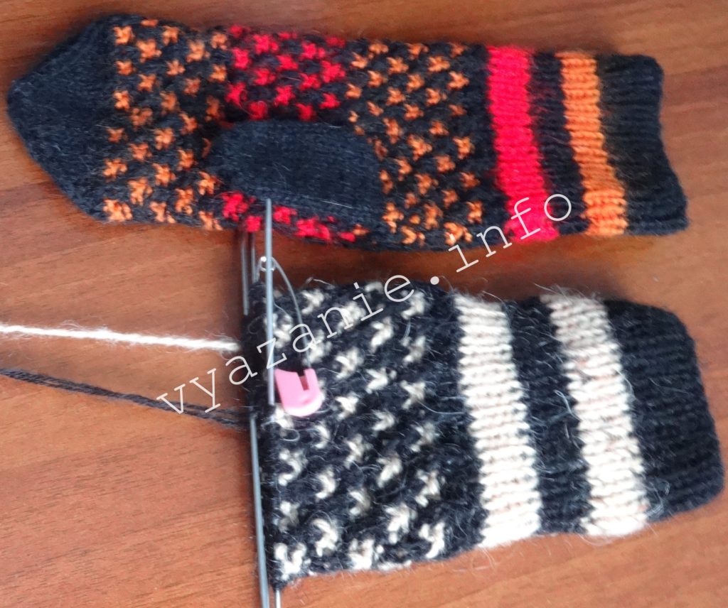 И так, приступим вязать варежки. В первую очередь свяжите варежку на левую руку. На правую руку свяжите потом варежку в зеркальном отображении.