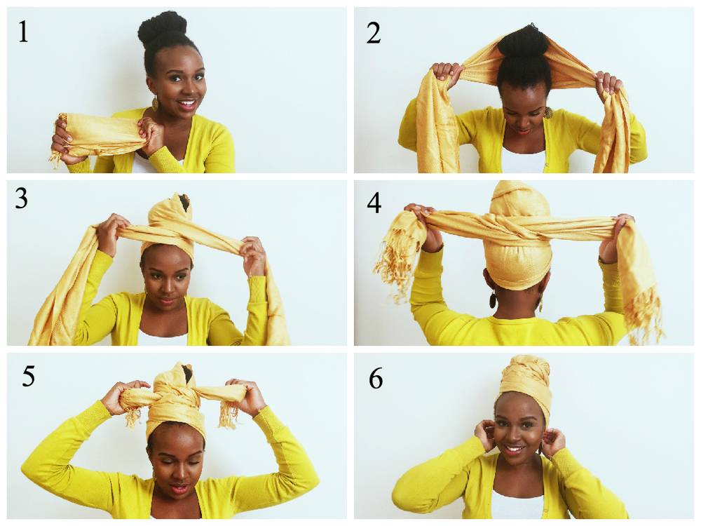 Африкаанс. При этом способе волосы средней длины завязываются в хвост, а длинные волосы укладываются в пучок. Покройте тканью всю голову. Скрестите концы сзади и подведите их ко лбу. Перекрестите концы и снова вытяните их назад. Сделайте еще один узел над лбом, заправляя концы перед узлом.