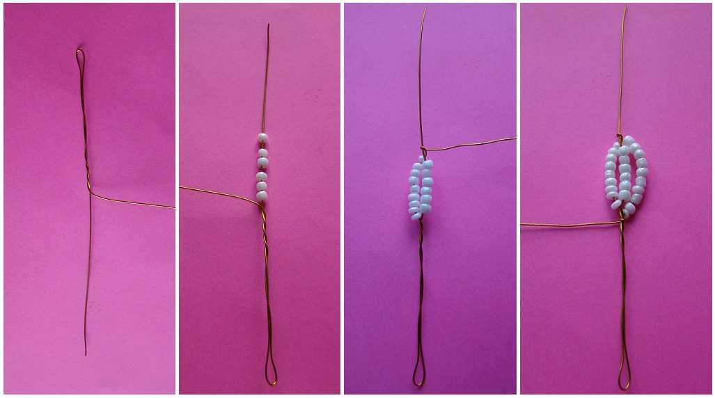 Придвиньте все бисеринки, которые на центральной проволоке, вплотную к скрученному участку большой петли, а на свободный хвост проволоки наденьте столько бисерин, чтобы они образовывали дугу вокруг центральных. Последнюю бисеринку поверните так, чтобы она легла на центральную проволоку, а между рабочей и центральной проволокой образовался угол 90 градусов (рис.3).