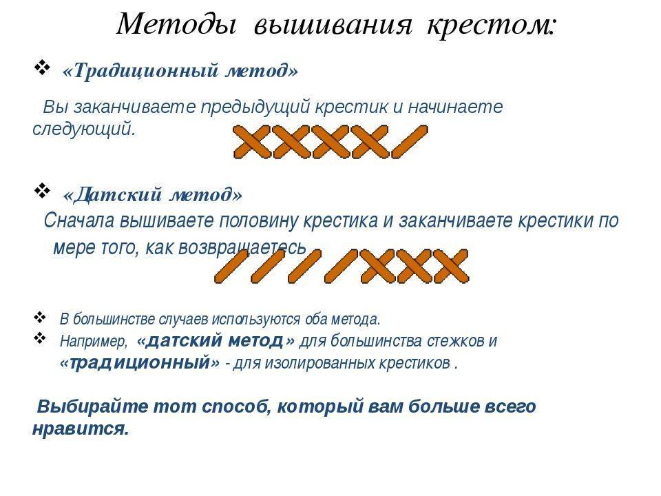 По канве вышивают не только простым крестиком. У опытных мастериц существует множество видов стежков. Это и полукрестик, и прямое и косое, широкое гобеленовое шитьё, шитьё рубчиками, гобеленовый шов. Также используют удлиненный крестик, двойной крестик, рисовые кресты, стежки «папоротником». Даже кашемировое, флорентийское, мозаичное, венгерское шитьё – всего более 60 вариаций.