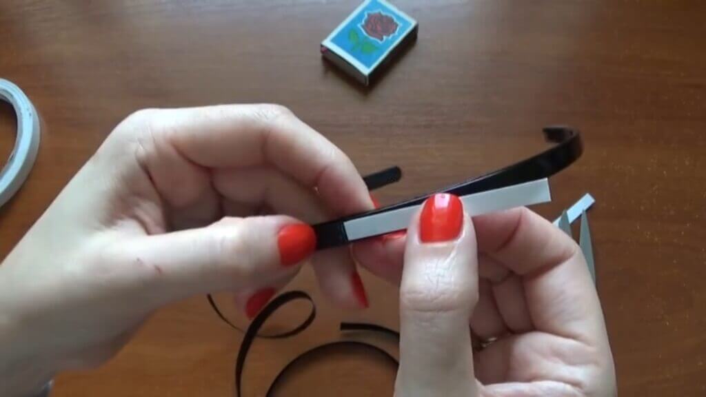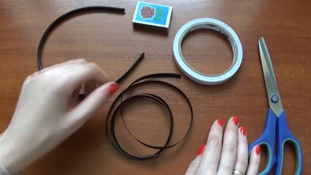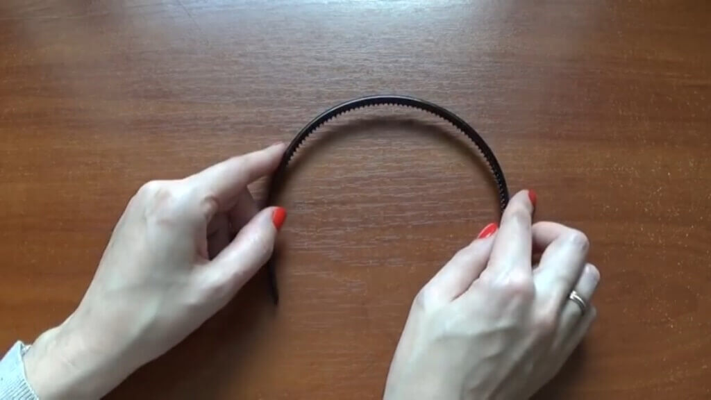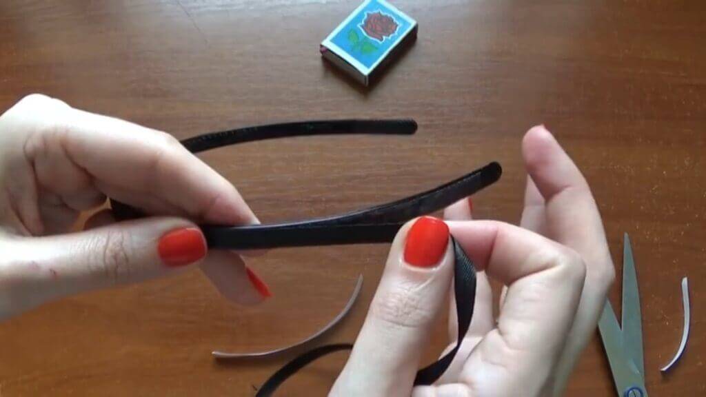 Нам нужно оформить ободок шёлковой или репсовой лентой, и затем уже делать к нему цветок или цветы. Самый простой способ оплетения ободка в стиле канзаши – при помощи двухстороннего скотча. Лента для декора должна быть такого же размера, как и ободок. Мы будем оформлять только внешнюю сторону ободка, чтобы не убирать внутренние шипы.