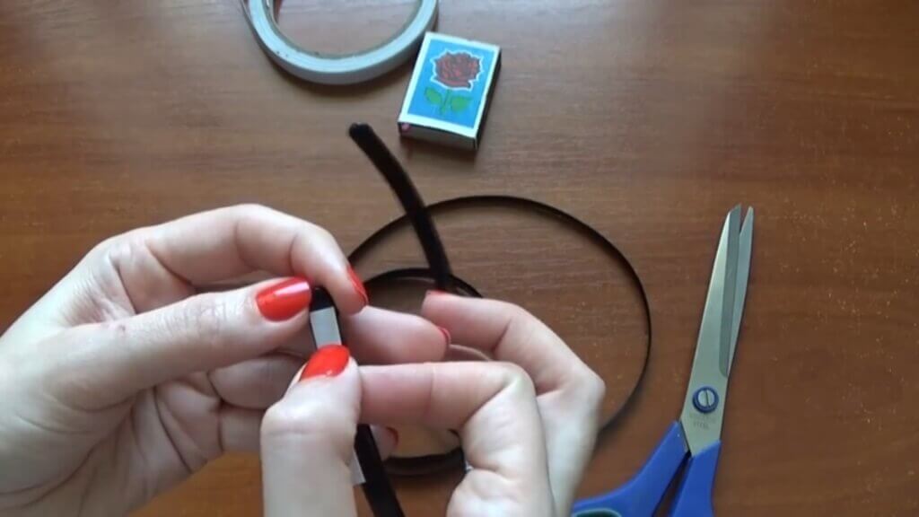 Обязательно концы ленты стоит опалить зажигалкой, чтобы лента не распалась во время работы. Сам отрезок нужно сложить пополам и кончики ленты загнуть во внутрь.