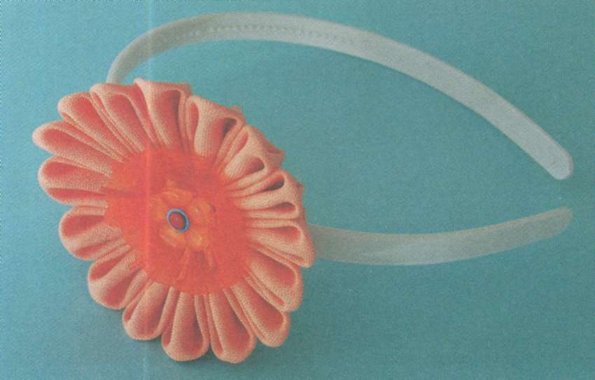 Теперь Вы знаете, как сделать круглый лепесток канзаши. Полученную заготовку цветка необходимо приклеить на основу. В качестве основы возьмем круг диаметром 5 см. Если вы будете делать изделие из квадратов 5 х 5 см, то диаметр цветка будет меньше и, соответственно, диаметр основы можно взять также меньше. После приклеивания цветка на основу получим плоское изделие диаметром 8 см (рис. 19-20), которое после доработки (декора серединки цветка) прекрасно подойдет для заколки или обруча. Подробный мастер класс по созданию круглых лепестков канзаши практически закончен.