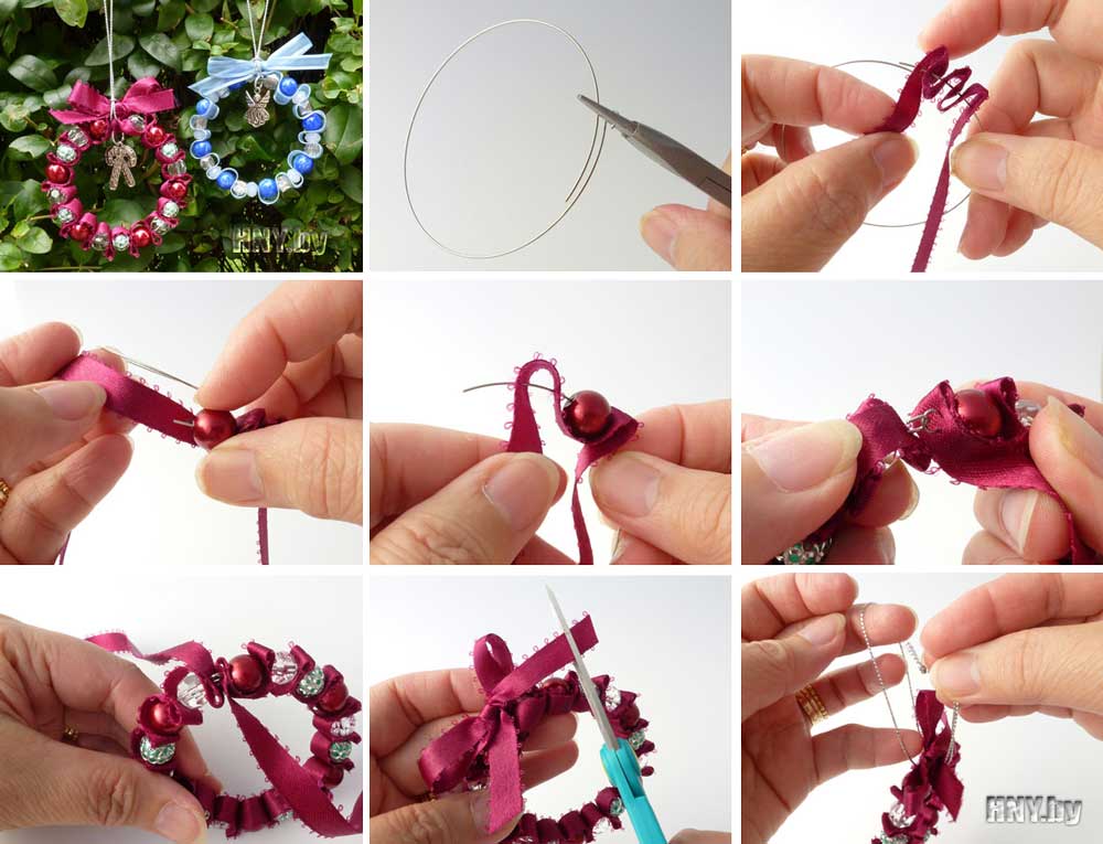 Миниатюрный венок из ленты и бусин можно повесить на елку в качестве украшения, а можно подарить кому-нибудь в качестве новогоднего сувенира, сделанного своими руками. Для изготовления Вам понадобится леска, лента и бусины. Можете также использовать дополнительные элементы декора, например подвеску и бант.
