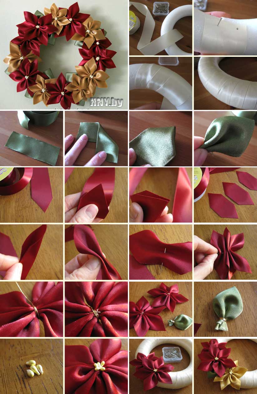 А вот вариант новогоднего венка из атласных цветов. Цветы получаются весьма реалистичными и кажется, что изготовление такого венка займет немало времени. На самом деле это не так. Сделать такую поделку из лент достаточно просто. Убедиться в этом Вы можете через МК.