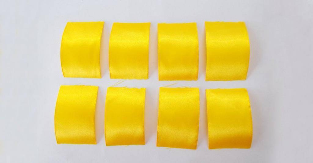 - Нарезать желтую ленту шириной 5 см на кусочки длиной 6 см. Таких деталей потребуется около 40 штук.