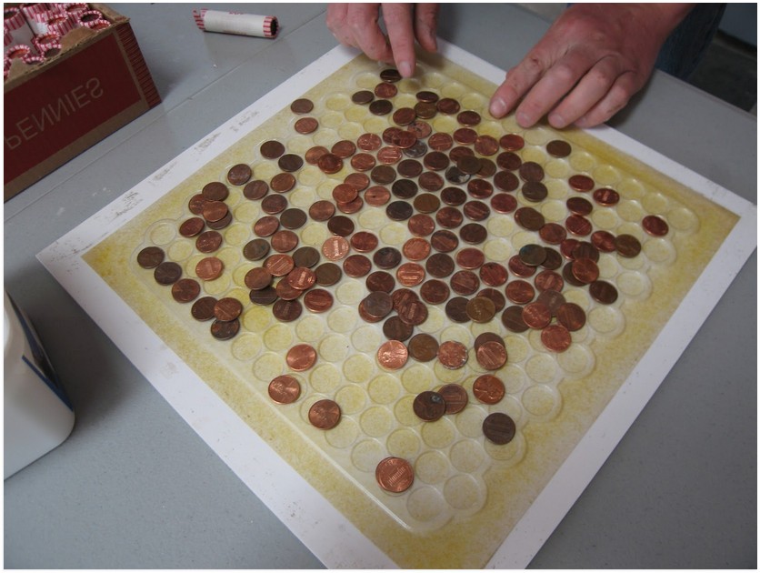 Как только состав высохнет, можно смешать эпоксидный герметик с UV-блокатором и нанести смесь на поверхность. Она заполнит все промежутки между монетами и стекловолокном. До полного высыхания ходить по полу категорически нельзя. На полное высыхание может уйти до трех дней.