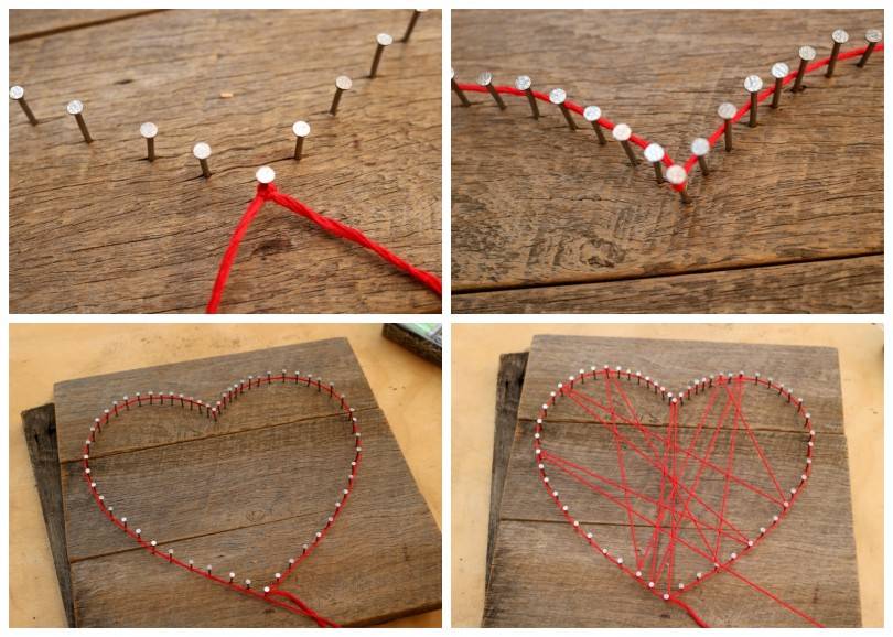 Из пряжи и гвоздей можно сплести любую картину, главное подобрать шаблон и материалы. Начинать работу необходимо с чего-то простого, поэтому предлагаем вам изготовить сердечко.
