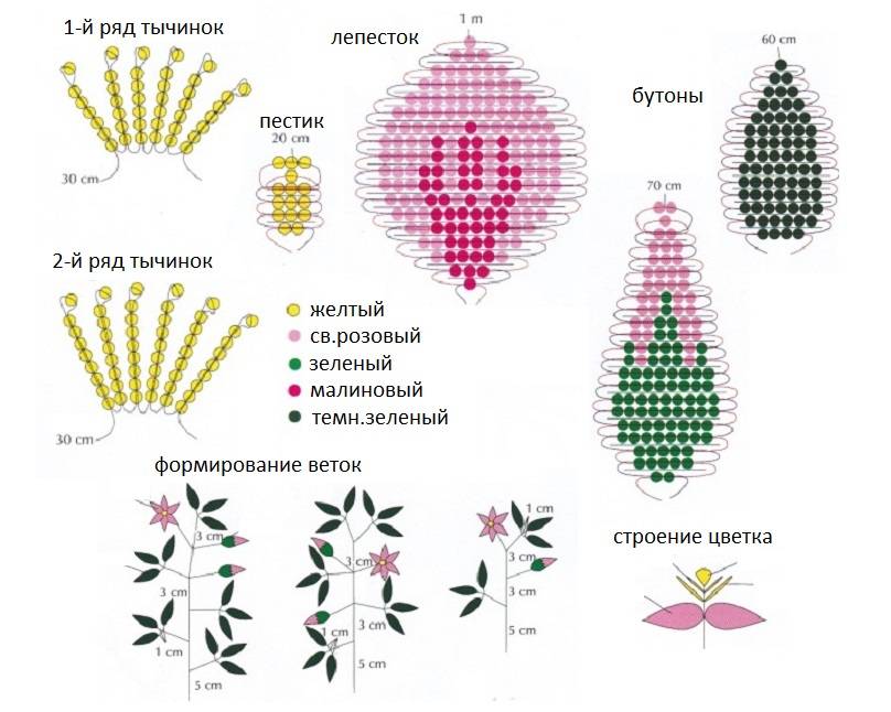 - бисер различных расцветок: несколько оттенков розового, желтый, оттенки зеленого и малиновый;