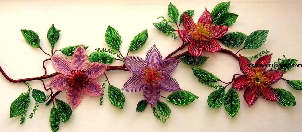 - Клематис из бисера выглядит ярко и естественно. Необычный интерьерный декор будет напоминать вам о летних днях даже в холодную зимнюю погоду.