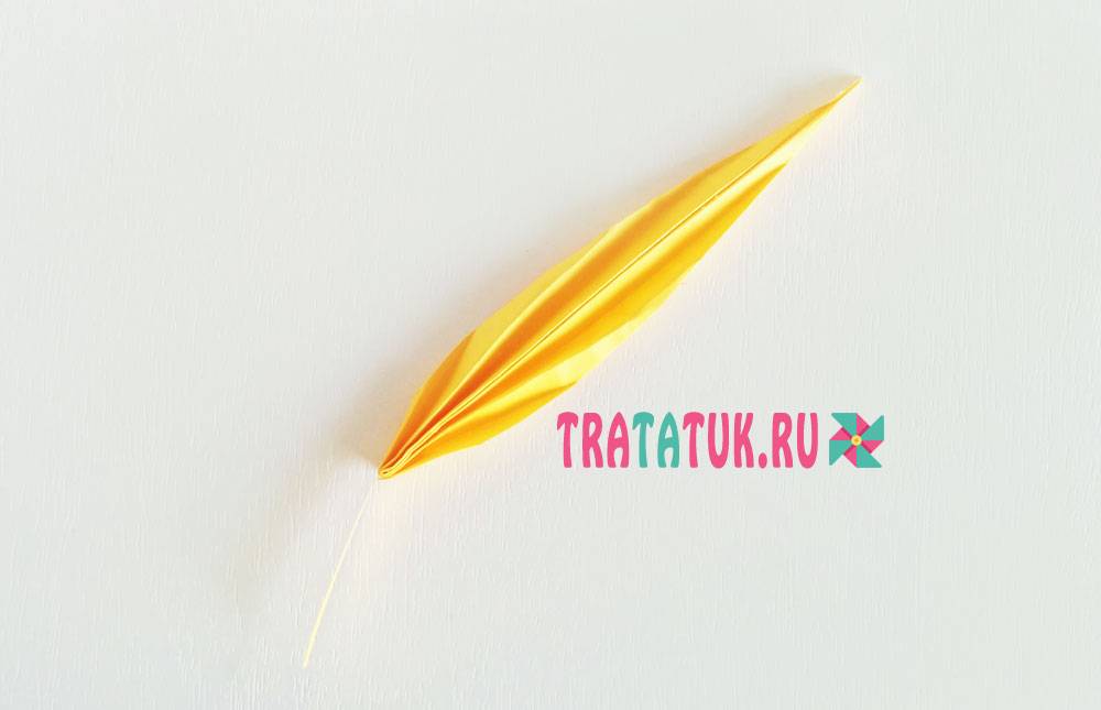 - Остается сделать стебелек. Схема его создания проста. На заднюю часть основания листочка приклейте оставшийся квадрат уголком вверх так, чтобы его половина была видна. Надрежьте боковые стороны по контуру листика, но не отрезайте до конца. Из образовавшегося хвостика сложите стебель, накладывая углы один на другой.