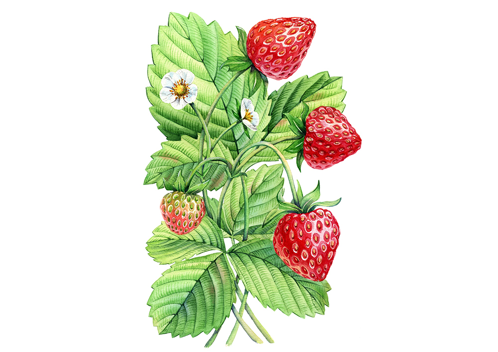 Добавляем на верхушки клубники немного листвы. Утолщаем линии стебель, а на листочках прорисовываем дополнительные прожилки. Вырисовываем цветочки.