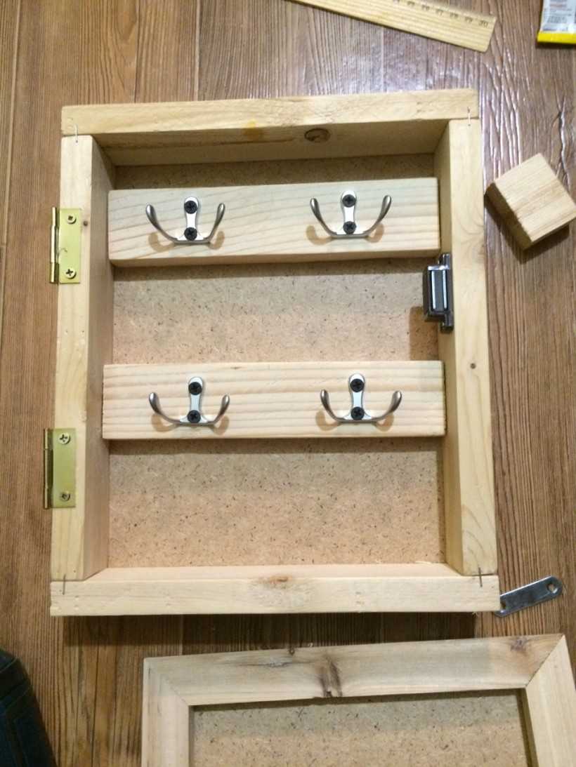 - Отпилить еще два брусочка по ширине шкафчика, прикрутить их саморезами внутри коробочки. Они станут небольшими полочками и хранителями ключей одновременно.