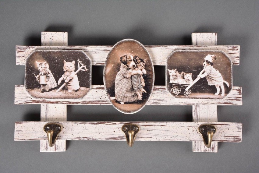 - Приклеить туловище кошки к рейке. Сделать петли с внутренней стороны и повесить ключницу на стену.