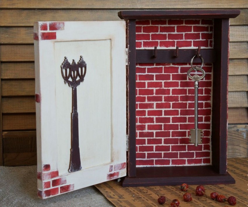 - Для натурально-деревенских стилей подойдет обычное неокрашенное дерево или расписанная сельскими мотивами ключница.