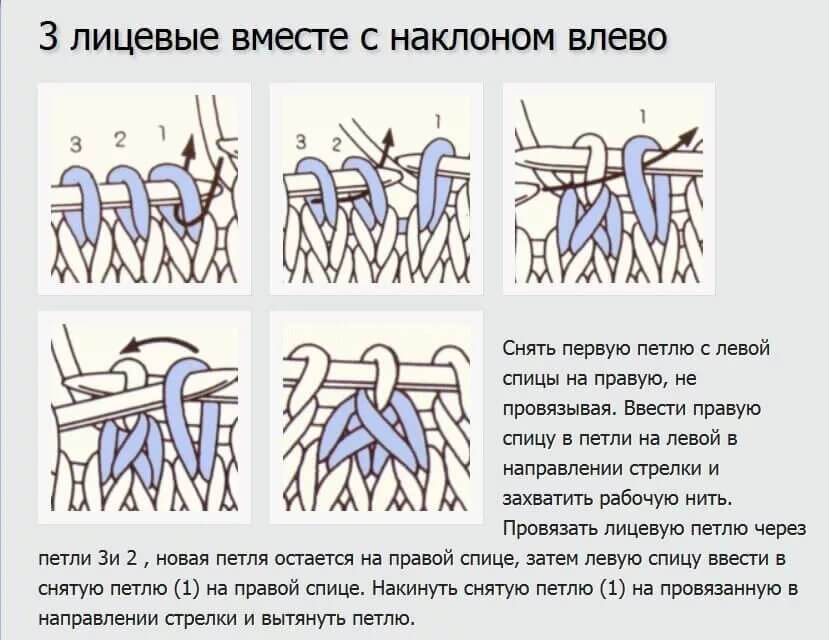 Убавки делать в каждом 6-ом ряду, убавлять по 2 п. с каждой стороны. Для того, чтобы получились красивые убавки, делаем наклон п. вправо и влево. Всего убавок 19 раз по 4 п. Убавляем в лицевых рядах таким образом: 1 кром., 1 лиц, и 3 п. вместе с наклоном вправо – затем по узору, в конце ряда – 3 лиц. вместе с наклоном влево (схема внизу), 1 лиц., 1 кром.