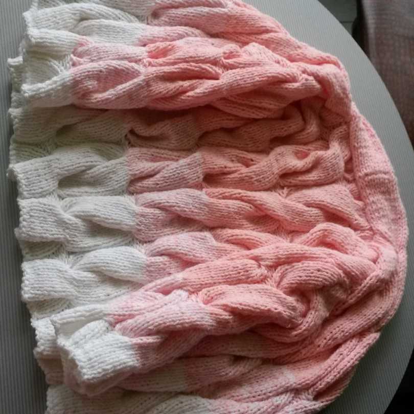 Повторять последние 2 ряда пока на спицах не останется 83 пет., выполняя ряд с дырочкой для пуговки каждые 10 рядов.